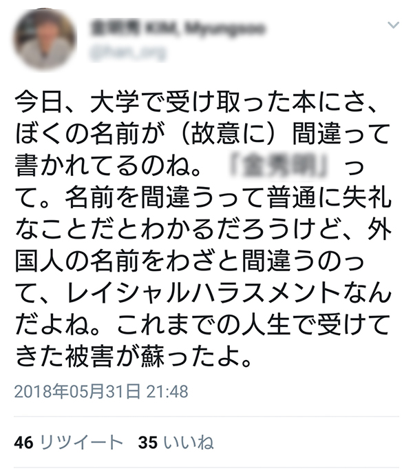 在日朝鮮人の名前を間違うのはヘイトスピーチです。
