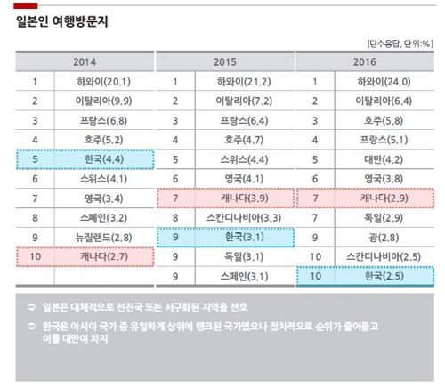 一方、訪韓日本人観光客は減少している。2010年から2016年まで訪韓日本人観光客の年平均増加率はマイナス4.5%だった。