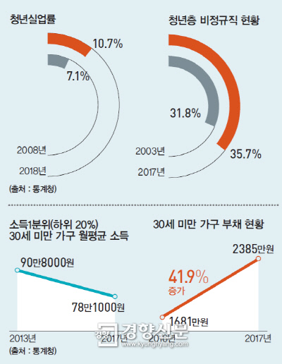 청년들의 삶을 보여주는 각종 지표는 최악을 향해 달려가고 있다. 청년실업률은 10.7%(2018년 4월 기준)로 10년 전인 7.1%(2008년)보다 높아졌다. 그나마 취업에 성공한 청년들도 안정적인 삶을 보장받지 못한다. 통계청 ‘경제활동인구조사’ 결과에 따르면 청년층 임금노동자 가운데 비정규직 비중은 35.7%(2017년 8월 기준)에 달한다. 60세 미만 근로자 가운데 유일하게 청년층 비정규직 비율만 높아졌다. 2003년 8월 기준 31.8%에서 14년 사이에 3.9%포인트 증가한 수치다.