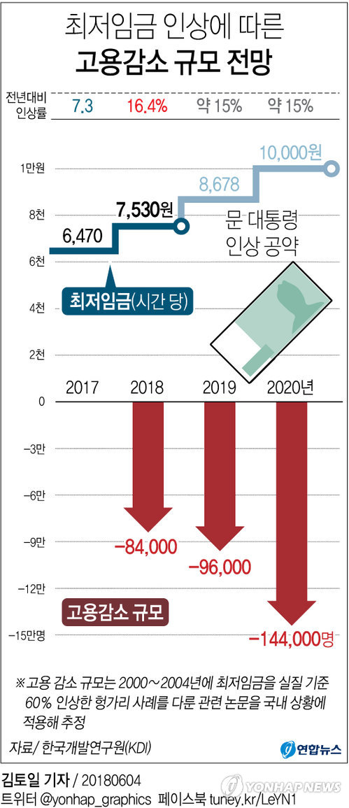 4日チェギョンスKDI先任研究委員は、2年間の最低賃金を年間15%ずつ上げると、それによる雇用の減少の規模が2019年9万6千人、2020年14万4千人に達することができると予想した。