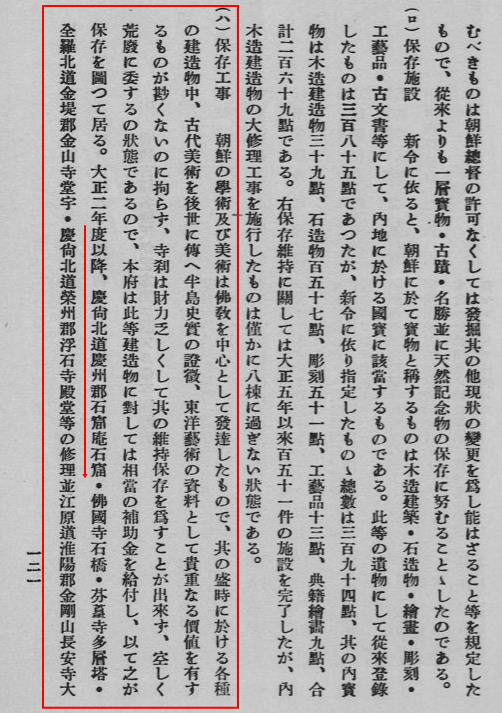 日本は1915(大正4)年に朝鮮総督府博物館を設け、1916(大正5)年には「古蹟及遺物保存規則」を施行して朝鮮の文化財を保護し、朝鮮先住民の遺物まで保存していました。
