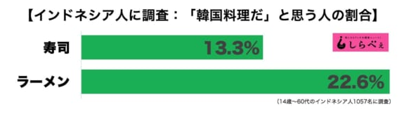 「寿司は韓国料理」と考えている人の割合は2割を超え、ラーメン=韓国料理派については4割に迫った。どちらも、今回調査した3ヶ国でもっとも多い割合だ。