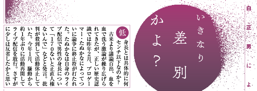 発売中の実話BUNKAタブー4月号、白正男先生の連載のテーマは「ゲーマー・たぬかなによる低身長差別の問題の本質」。人権派義士・白先生は「(男は身長)170ないと人権ないんで」発言で炎上したたぬかな氏を批判するつもりは毛頭ないとのこと。この問題の本質を無識な日本国民に解説してくれました。