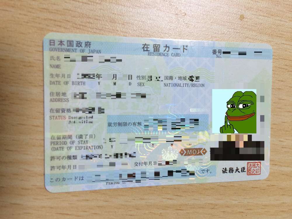 嬉しすぎて喜びのあまりか在留カードにモザイクかけてupしているようだが、