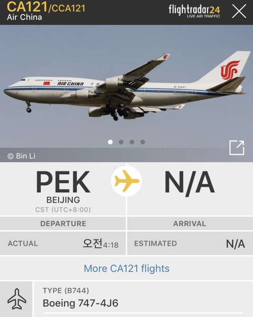 航空機経路の追跡サイトフライトレーダー24によると、エアチャイナCA121便は、同日午前4時18分(中国時間)、北京ソオヅ(首都)空港を出発し、同日午前6時20分(北朝鮮時間あたり)に平壌に到着した。