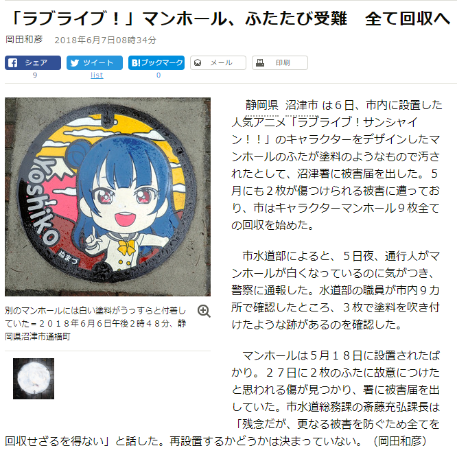 5월에도 2장이 손상되는 피해를 당하고 있어, 누마즈 시는 캐릭터 맨홀 9장 모두 회수에 들어갔다.