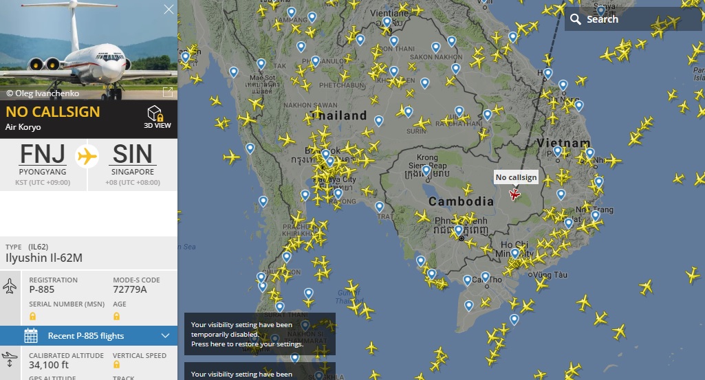【北京聯合ニュース】北朝鮮の金正恩(キム・ジョンウン)国務委員長(朝鮮労働党委員長)の専用機「チャムメ1号」が10日、午前9時半(日本時間)、シンガポールに向け平壌を出発した。飛行中の航空機の位置をリアルタイムで表示するウェブサイト「フライトレーダー24」によると、「チャムメ1号」は北京の上空を通過した後、西南方向に向かって飛んでいる。