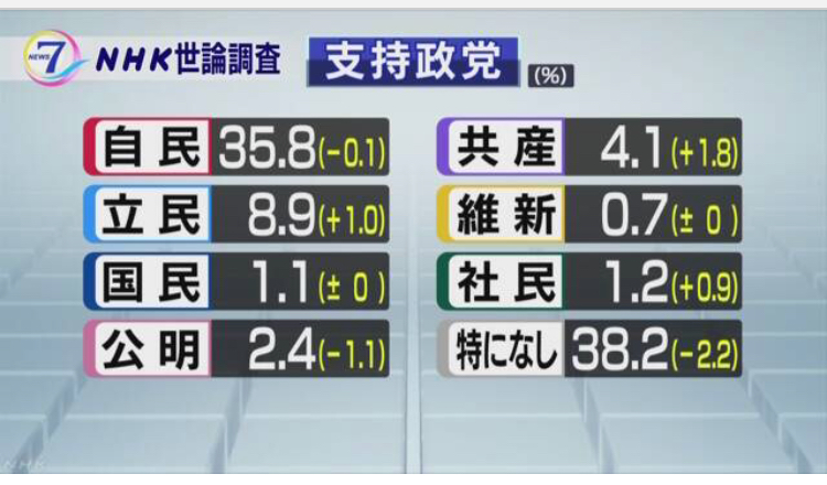 NHKの世論調査によりますと、安倍内閣を「支持する」と答えた人は、先月と同じ38%で、「支持しない」と答えた人も、先月と同じ44%でした。