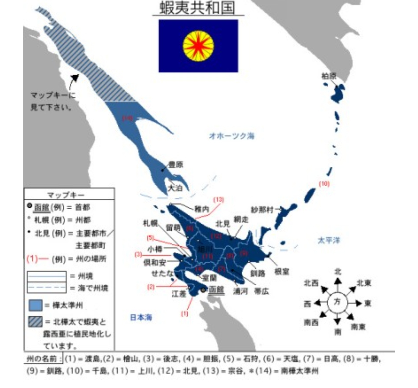 それは幕末期に函館五稜郭に拠った旧幕府勢力が名乗った「蝦夷共和国」のことだね。画像の旗はその際国旗として選定されたもの。史上初めてアジアで樹立された共和制国家とも解釈される。