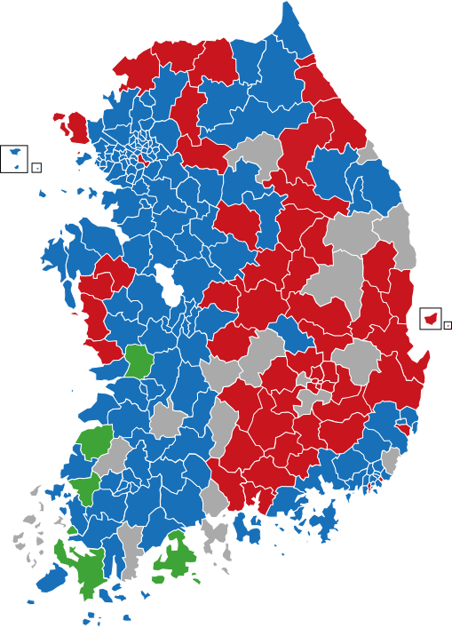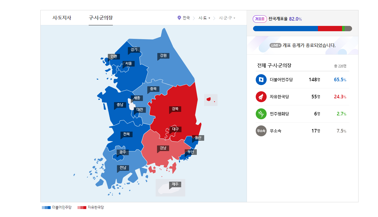 6월 1일 지방선거에서 출구조사 결과 보수당인 '국민의힘'이 10곳에서 승리 예상. 이전의 집권여당인 '민주당'이 4곳에서 승리 예상- 29