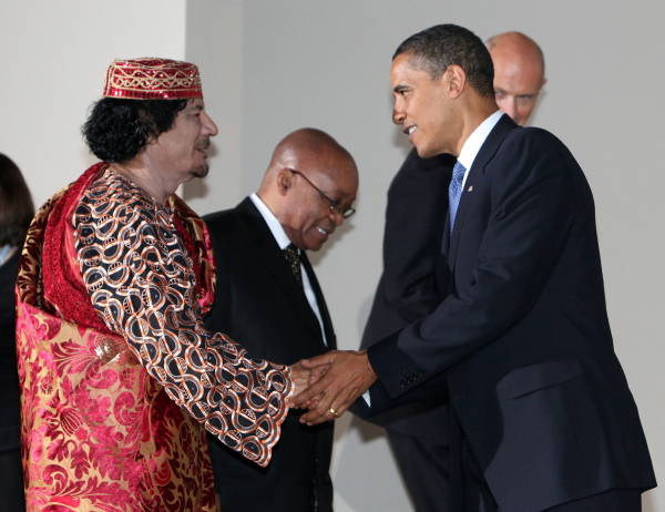 イタリア・ラクイラ主要国首脳会議(サミット)の会場でオバマ米大統領(右)と握手するリビアの最高指導者カダフィ大佐。