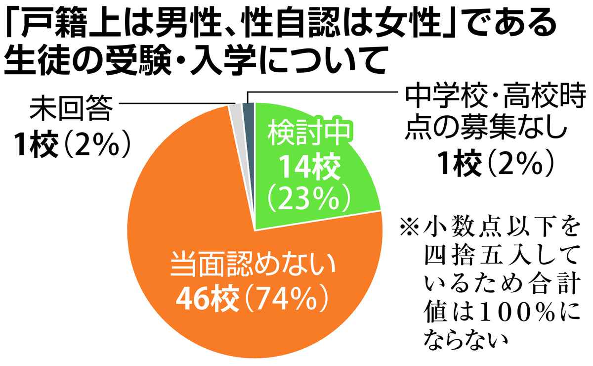 トランスジェンダーの生徒の受験や入学を認めるかどうかの質問に対し、「検討中」としたのは、女子学院中学校・高校(東京)や神戸女学院中学部・高等学部(兵庫)、奈良文化高校(奈良)など14校(23%)。女子学院の担当教員は電話取材に「世の中の流れを踏まえて検討していきたい」と話した。