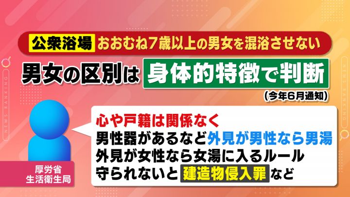 公衆浴場を管轄している厚生労働省では、生活衛生局の担当者によると「おおむね7歳以上の男女を混浴させない」と定めた指針があり、男女の区別については2023年6月、「身体的特徴で判断するもの」とする通知を出しています。