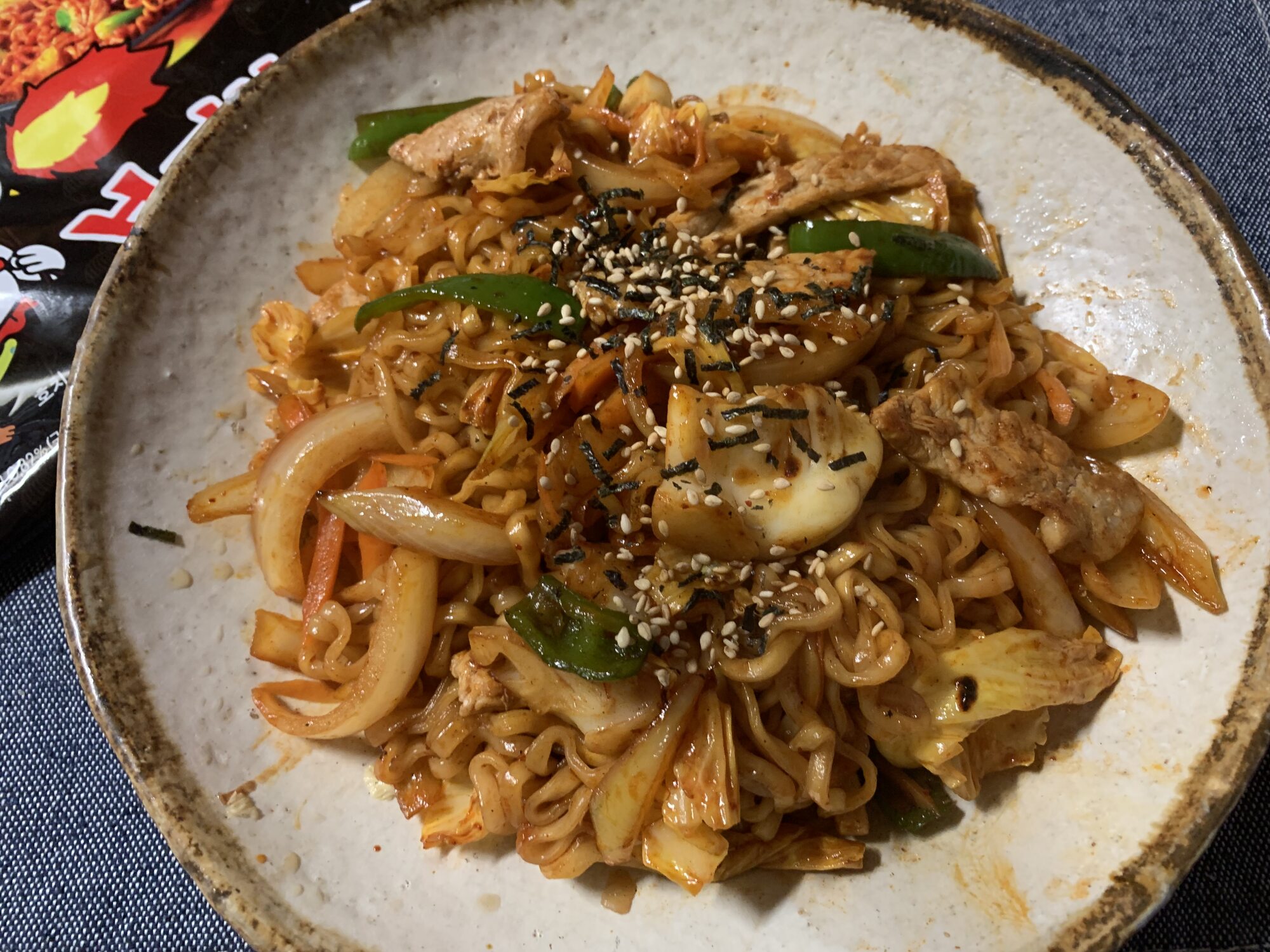 (日本向け袋麺)。辛ラーメンの袋麺に卵を入れて食べる