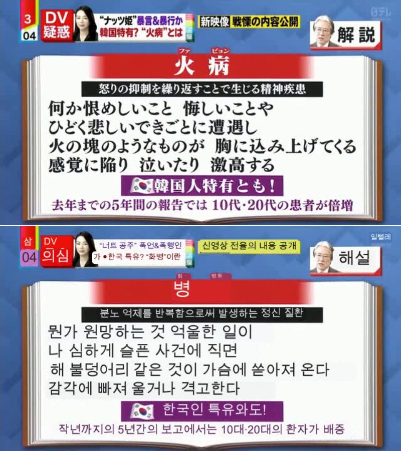 後に火病という朝鮮にしか存在しない精神病が同じ症状だといわれている。韓国特有の病気とされる「火病」が急増