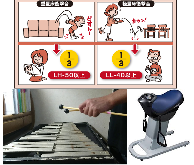 どの様な遮音材を床に使っても、音は床から伝わるほか、壁の中の鉄骨を伝わって広がる。