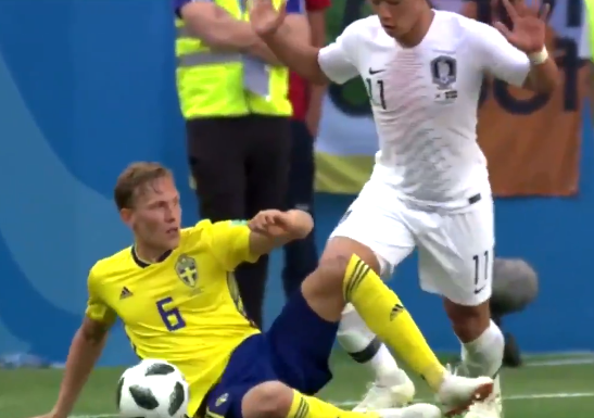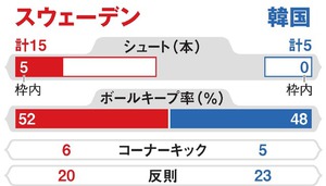 世界ランキング57位の韓国は同24位のスウェーデンを相手に、序盤はDFを厚くした上で俊足のソン・フンミンを前面に押し出し逆襲を狙った。しかし、後半に金民友(キム・ミヌ)がペナルティーエリア内でタックルして相手を倒しピンチを迎えた。笛はすぐには鳴らなかったが、試合中に審判がビデオ・アシスタント・レフェリー(VAR)による判定の結果PKとなり、キッカーを務めたアンドレアス・グランクビストが後半20分、冷静に右でゴールを決めた。その後、韓国は逆襲を狙ったが、W杯予選プレーオフでイタリアを破って勝ち上がってきたスウェーデンのDFの壁は破れなかった。