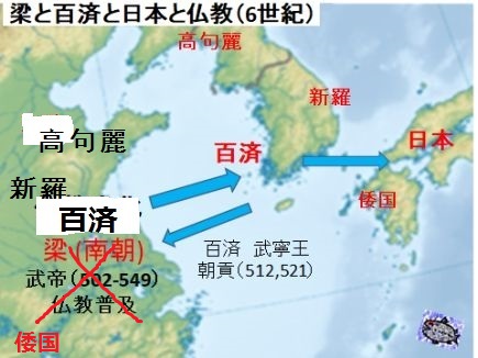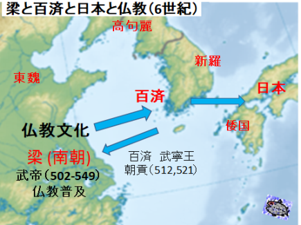 >한국인들은 백제 덕분에 고대 일본에 문명을 전수해주었다고 믿고 있지만, 사실 중국과 지리적으로 교류가 쉬웠던 백제가 먼저 도입한 문물을 일본에 전해주었을 뿐, 일본 역시 나중에는 중국과 직접 교류한다.