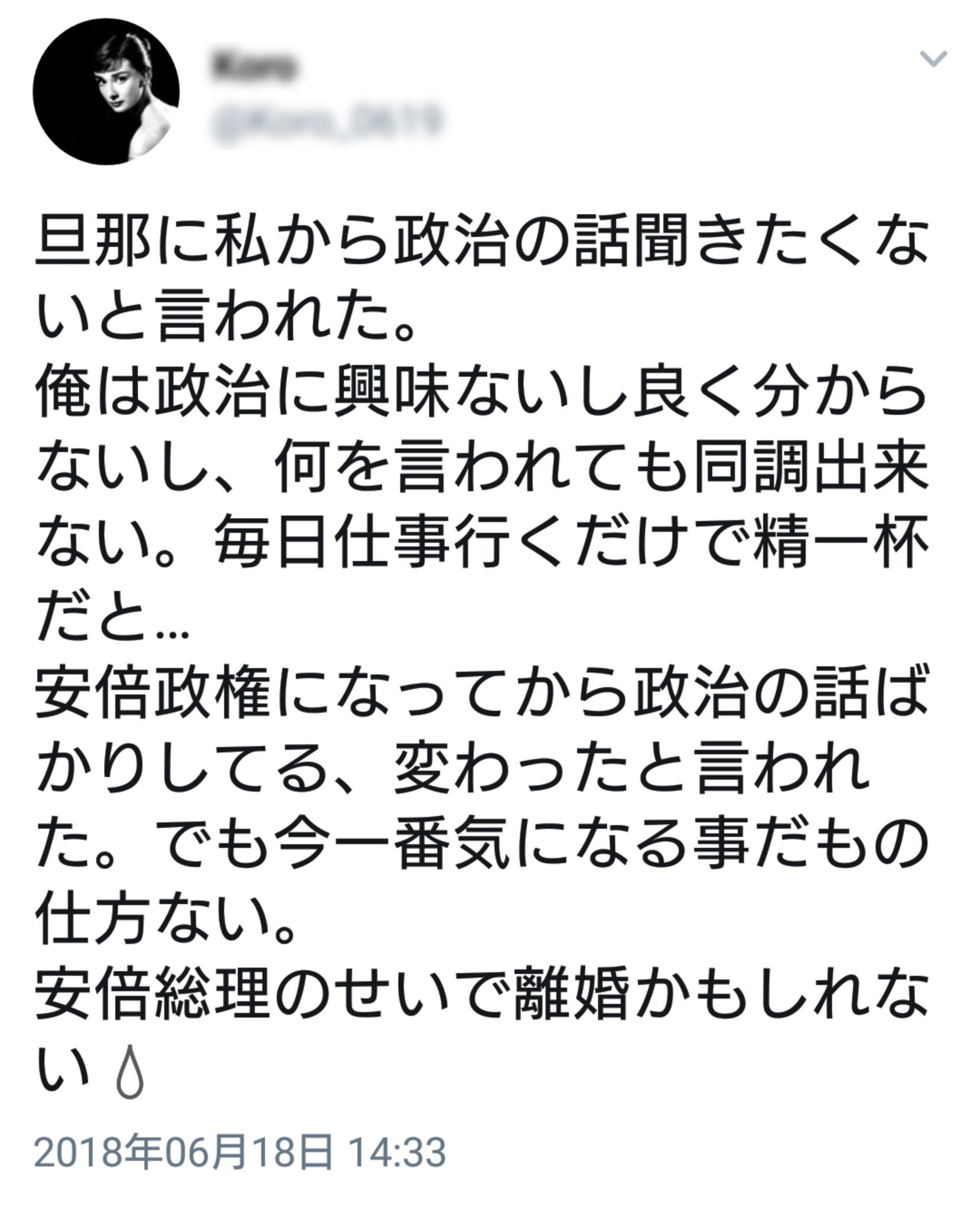 それが安倍ちゃんのせい?もしコイツがウチの嫁だとしたら、安倍政権に文句があるのなら政治家を目指すべきだよと諭し、以降政治の話をさせないと思うが、そもそもそんな嫁だと気付かなかった自分を責める事も忘れない。