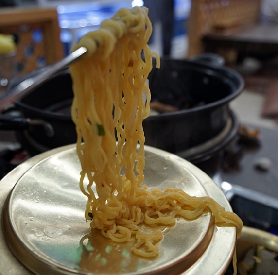 라면을 냄비의 덮개에 덜어먹는 모습입니다.