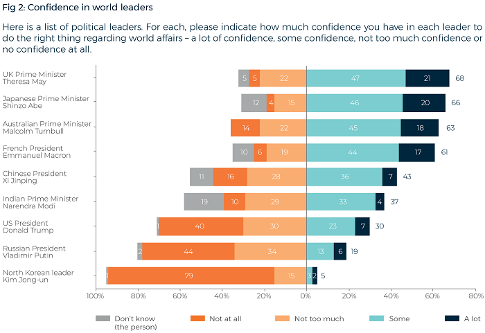 「信頼できる外国」の首位は英国で、3位以下はフランス、インド、米国、中国の順。「信頼できる世界の指導者」はメイ英首相がトップ。