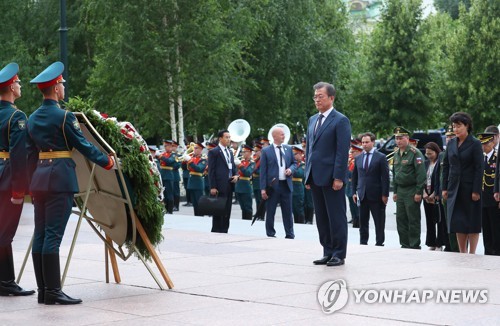 ロシアを国賓訪問中のムン・ジェイン大統領は21日、夫人金正淑女史と一緒にモスクワ「無名勇士の墓」を探して献花した。