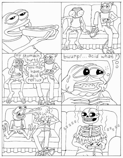 '4chan'이라는 영어권 사이트에서 사용하던 개구리 네요>>26 영어권 사이트에서는 '페페' 라고 불리는듯