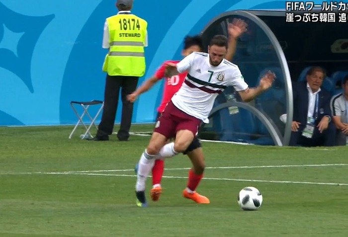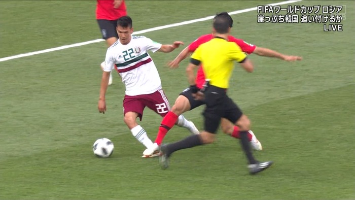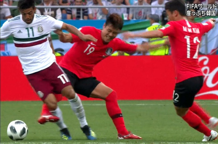 2つめは、24日のメキシコ戦前半24分だ。メキシコの攻撃エリア左からアンドレス・グアルダード(31)が上げたクロスを韓国のセンターバック張賢秀(チャン・ヒョンス、26)が阻もうとしてタックルした。ボールは張賢秀が伸ばした脚ではなく胸の方に飛んできて、手に触れてPKとなった。張賢秀は後半21分にもう1回、タックルのミスを犯した。逆襲を阻む状況でハビエル・エルナンデス(30)のフェイントにだまされて全力でタックルし、完全にやられた。