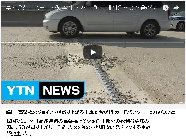防衛設備の車両進入爪そのままだな韓国--高架橋のジョイントが盛り上がって、車32台がパンク <動画>