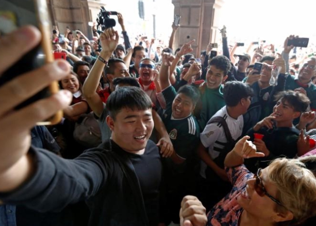 [メキシコ市 27日 ロイター] - サッカーのワールドカップ(W杯)ロシア大会で27日、前回覇者のドイツが韓国に敗れるという大波乱が起きたが、この結果に救われて一次リーグ突破を果たしたメキシコでは、ファンたちが韓国大使館の前に数百人集まり、韓国の健闘を称えてお祭り騒ぎを繰り広げた。