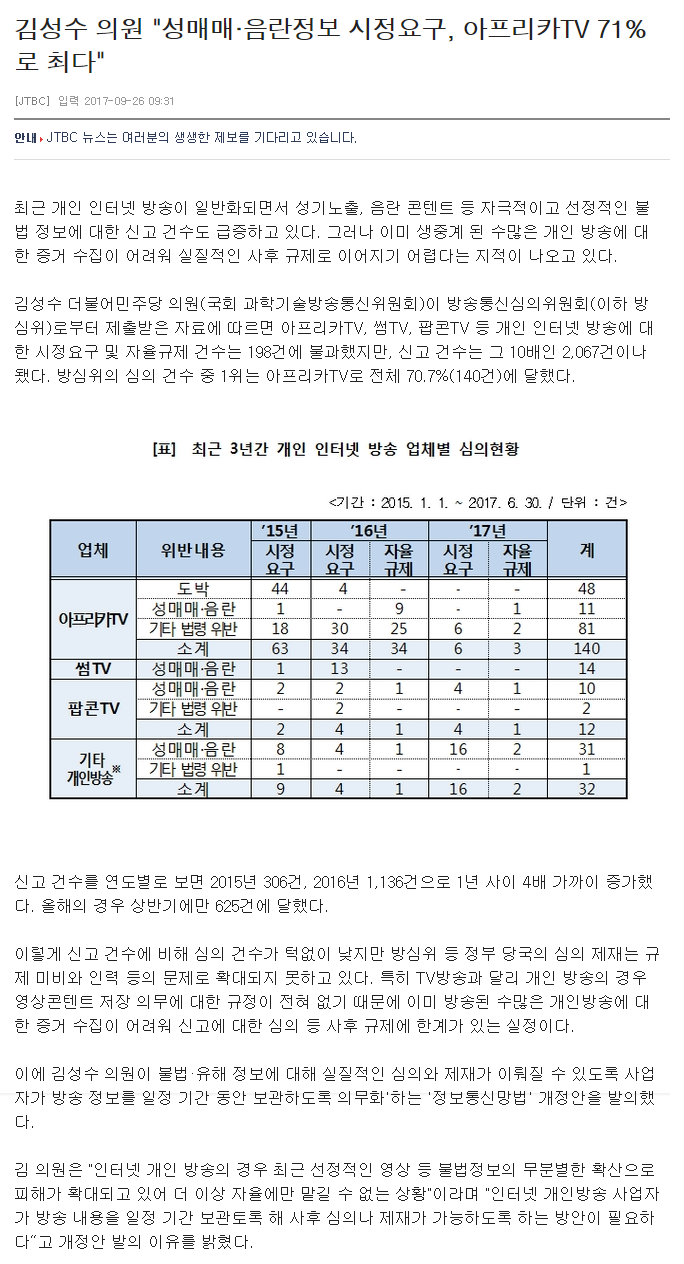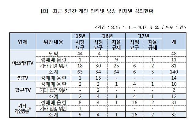 金性洙(キム・ソンス)、ダブル漁民一株当たり議員(国会科学技術放送通信委員会)が放送通信審議委員会(以下油断の上)から提出を受けた資料によると、アフリカTV、サムTV、ポップコーンTVなど、個人の放送に対する是正要求や自主規制件数は198件に過ぎなかったが、申告件数は、その10倍の2,067件もなった。 油断の上の審議件数のうち、1位はアフリカTVで全体70.7%(140件)に達した。