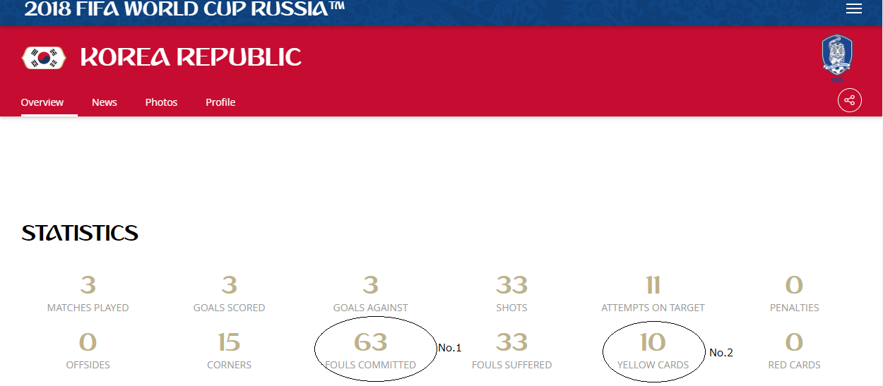 決勝トーナメント楽しみだな♪WC杯 韓国のファウル数(グループリーグ)