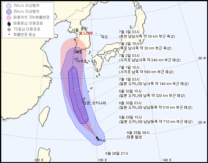 기상청에 따르면 29일 오전 9시 일본 오키나와 남남동쪽 약 740km 부근 해상에서 태풍이 발생해 북상 중이다. 이 태풍은 다음달 2일 오전 9시 서귀포 서남서 쪽 약 70km 부근 해상으로 접근한 뒤 오후 9시에는 서산 남쪽 약 20km 부근 육상까지 북상할 것으로 보인다.