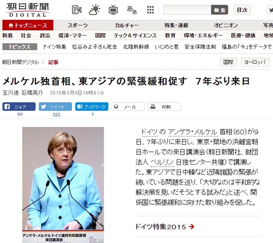 메르켈 총리는 9일, <아사히신문> 주최로 열린 도쿄 강연에서 "전범국 독일이 주변국과 화해하고 국제사회의 일원으로 받아들여진 것은 독일이 과거사를 직시했기 때문"이라고 강조했다.