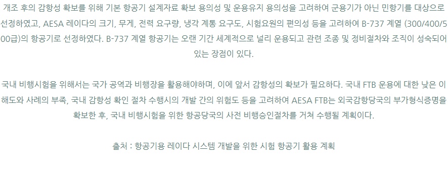 議員はAESAレーダーの技術について、防衛事業庁は韓国内で開発した技術で製造したテスト機を地上で試験中だというが「実際には米国のプリスケール社と、ドイツのインフィニオン社からモジュール部品を輸入し組み立ててイスラエルに試験をしてもらっているだけ。」と指摘。