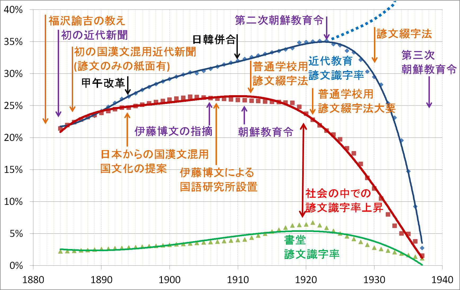 <1930年の朝鮮国勢調査では60才以上の高齢者でも20%ほどの人がハングルが読めたことがわかっている。