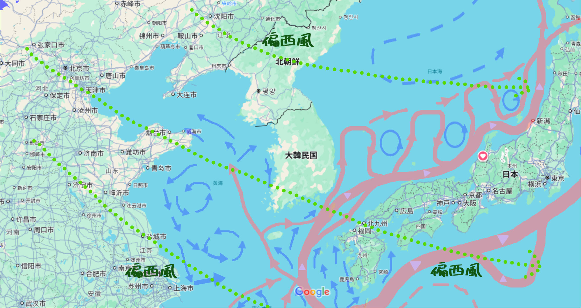 でも、対馬と半島の間は時速6kmで西北西と半島沿いに北上していく海流になる。幾ら漕いでも西北西に流されていき、能登や蝦夷地(東北や北海道)に流れていく。実際、北海道で丸太舟の残骸も発掘されてますし。