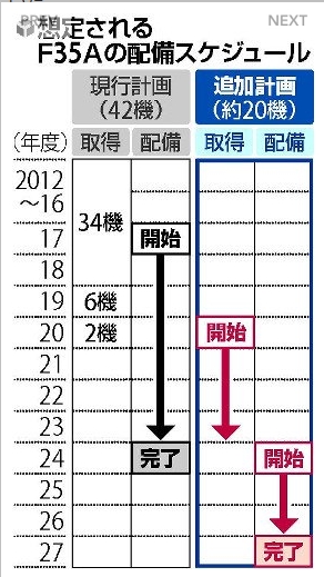 複数の政府関係者によると、追加取得は早ければ20年度から始める。約20機は1飛行隊分にあたる。配備候補地は空自の新田原基地(宮崎県)、百里基地(茨城県)などが浮上しており、配備時期は24~27年度頃を想定している。新田原なら、中国を念頭に置いた南西方面の防衛態勢強化につながる。政府は年末までに候補地を絞り込む。