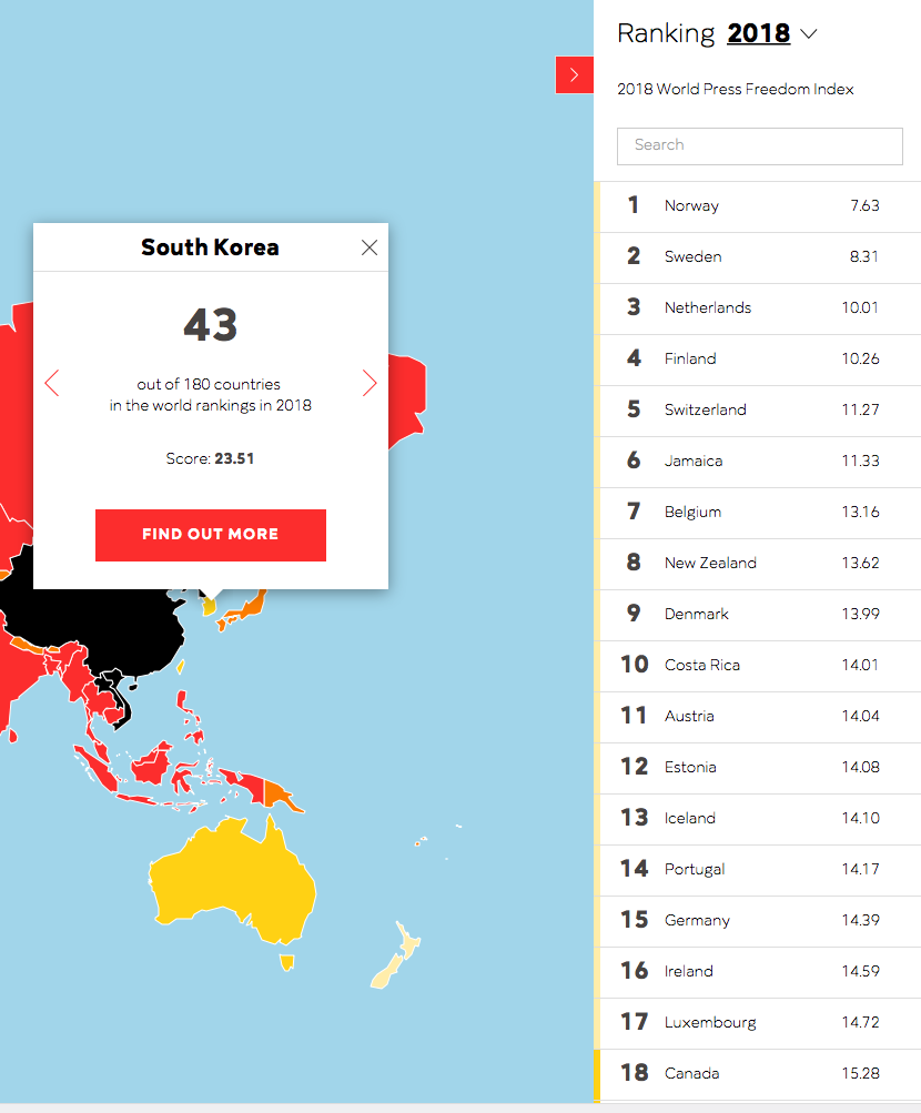 1名無し2018/07/06(Fri) 01:39:13ID:Q4Njk2MDQ(1/1)NG報告2018년, World Press Freedom (국경 없는 기자회) : 언론의 자유 순위https://rsf.org/en/ranking2개의 코리아가 양극단을 달리고 있다.>>8>>19>>31>>37>>410