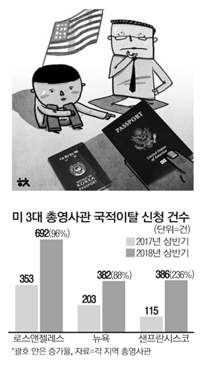 韓国と米国の国籍を生まれた時から保有している先天的二重国籍者の米国ではなく、韓国国籍を放棄する申請者が今年上半期過去最大を記録したことが分かった。米国の韓国人の間でも「アメリカファースト」の雰囲気が明らかになっているのだ。韓国国籍放棄者は表面上は、5月1日から発効した「在外同胞法(在外同胞の出入国と法的地位に関する法律)」を理由に挙げ、がより根本的な原因は、韓国と米国の就業・起業機会の格差がさらに起こっているためとみられる。