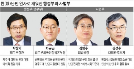 難民資格を最終的に決定する司法にも親和難民が大勢だ。キム・ミョンス長官が最初の会長を務めた裁判所内進歩性向学術会」国際人権法研究会」が代表的難民擁護グループに挙げられる。金長官は春川地方法院長だった2016年6月11日開かれた「難民などの国際的な保護に関する司法の役割」カンファレンスで直接社会を務めた。