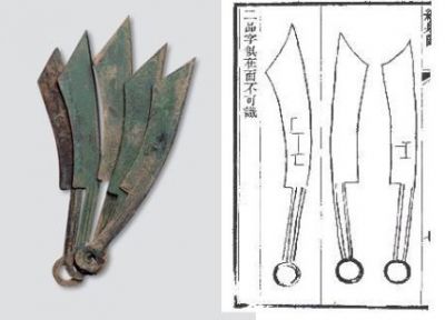19세기 중국의 고대 화폐 연구가인 李佐賢의 저서 ‘續泉匯에서 ‘돈’자가 새겨진 尖首刀의 탁본이 실려있었고, 중국 책 ‘’(燕下都東周貨幣聚珍)과 ’(中國錢幣大辭典: 先秦篇)에서는 ‘노’자가 새겨진 尖首刀의 탁본을 발견했다고 밝혔다.