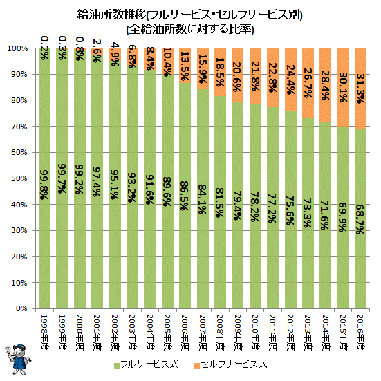 2016年の時点でセルフ給油所は全体の31%程度です。