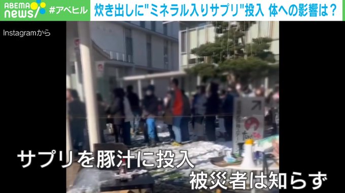 炊き出しの豚汁に“ミネラル入りサプリ”投入 被災者は知らず 団体は「どれだけ摂っても問題ない。アンチは無知」一方で健康被害の恐れも