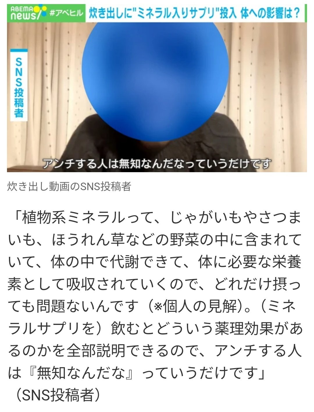 「70種類以上の植物系ミネラルです。ミネラルって、今の日本人の食生活の中に一番不足してる栄養素なんですよ。被災地の方々って、乾き物ばっかりっていうか、栄養がないものばかり食べている姿を見たときに、炊き出しの中に(ミネラルサプリを)入れて少しでも栄養を摂ってほしいなというのはすごくあった」(SNS投稿者)