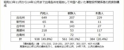 「昭和13年11月から14年12月まで台湾各州を経由して中国へ赴いた軍慰安所関係者の民族別構成 」
