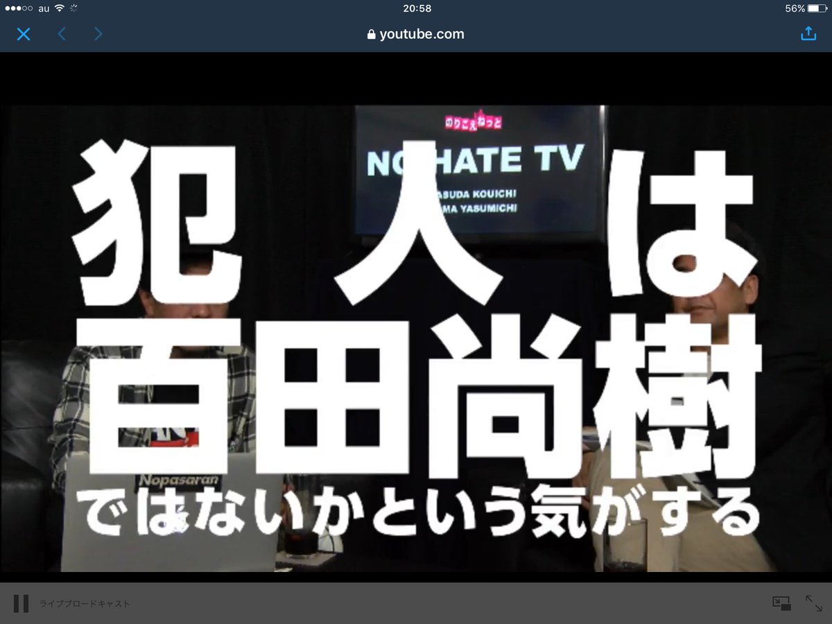 とある事件について、百田氏が過去に「私は(犯人が)在日外国人たちではないかという気がする」とツイートしたのをもじってタイトルを百田尚樹が犯罪者、犯人であるかのようにしている。ヘイトを乗り越えるはずの、のりこえねっとTubeさんが個人をヘイトしてどうするんでしょうか?しかも何故この個人に対する誹謗中傷動画も今回のBAN祭りの通報対象に入っていないんでしょうか?コメント>>8で言った個人誹謗中傷動画も載せます。