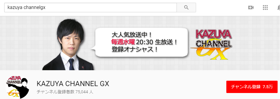 14名無し2018/07/18(Wed) 10:02:26ID:AzOTU0MzQ(1/1)NG報告本人が消される旨を予見してたから、別チャンネルを本格化してたよね。https://www.youtube.com/user/kazuyachgx登録者数75000人と以前より小ぶりになったが。2