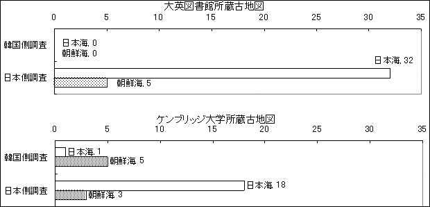 (2) 今回の日本側調査では、18世紀末以降のヨーロッパで作成された地図においては、「日本海」という名称が圧倒的に多く使用されていることが確認された(大英図書館所蔵古地図では86%に当たる32枚が、ケンブリッジ大学所蔵古地図では同じく86%に当たる18枚が「日本海」と記載していた)。