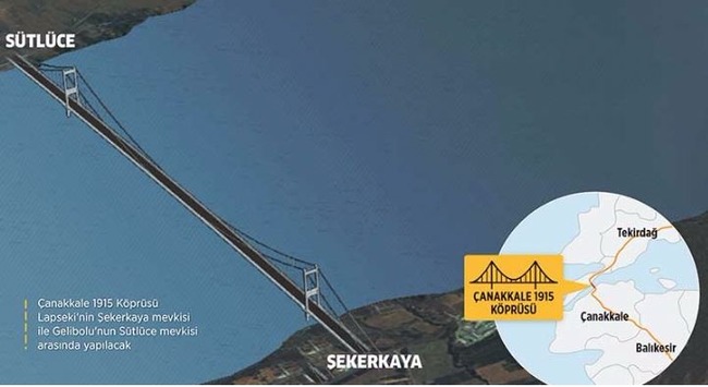 チャナッカレ吊り橋のプロジェクトは、ダーダネルス海峡を挟んで向かい合っているトルコ西岸チャナッカレ州のラープセキとゲリボルを連結する3.7キロ長さの吊り橋と付属道路を建設する事業だ。 完成すれば、日本神戸の明石大橋(1991m)を抜いて世界で最も長い吊り橋になる。 来る3月に工事が始まって2023年に開通の予定だ。
